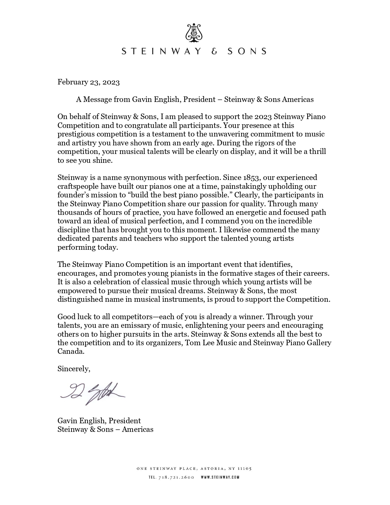 The Steinway Piano Competition establishes a platform for inspiring and cultivating young artistic talent. With the support of the most distinguished name in musical instruments, Steinway & Sons, young artists are empowered to pursue their musical dreams through mastery of Classical Music. Music breaks down barriers and has no borders. Each young Canadian artist becomes an emissary of music, enlightening their peers and spurring them on to a higher pursuit of the arts.
